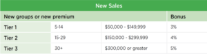 Your retention bonus will be tied to your sales tier. For example, if you sell 15 new groups and retain 90% of your existing book of business, you’ll qualify for a 1.5% retention bonus. But if you sell 15 new groups and retain 95% or more, you’ll qualify for 2% bonus.